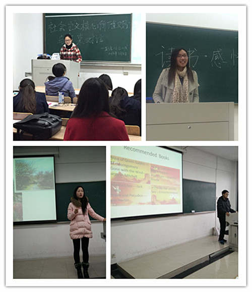 在加强对青年团员的思想引领的时候,学院分团委联合各班团支部结合外语专业特色,积极组织专业学习活动,增强青年团员对未来的信心,提升其个人能力和修养。英语1301班团支部就积极组织了读书分享会。《傲慢与偏见》,《简爱》等英文原著都被大家竞相传阅。这场以“读书·感悟·成长”为主题的读书研讨会,既促进了大家阅读外文名著的热情,也促进了学习之风的悄然兴起。在英语1301班同学还在以提升个人素质为目标,以践行社会主义核心价值观为方向进行名著传阅活动的时候,英语1302班团支部发起了一场“与未来对话”的主题团日活动。他们积极组织班里的同学参加活动,引导每位同学在纸上写上自己今后的目标,不论远近,不谈大小,只要是自己的理想即可。目的是让同学们认识到目标和理想的重要性,也督促大家为了自己的理想努力奋斗,不断前进。
